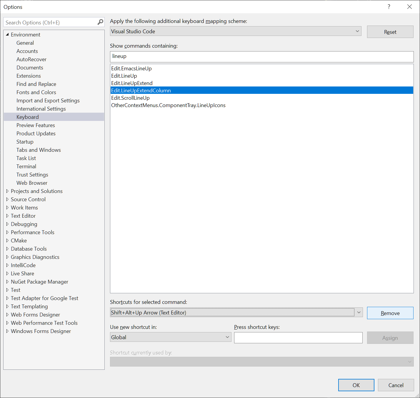 Shift + Alt + Up/Down으로 한줄을 복제할 수 있었는데, 이 설정은 따라오지 않아서 직접 바꿔줘야 한다. Edit.Duplicate항목의 단축키를Shift + Alt + Up,Shift + Alt + Down으로 두 번 할당해준다.Edit.LineUpExtendColumn,Edit.LineDownExtendColumn의 단축키 중 위에 해당하는 단축키들을 선택한 뒤 삭제해준다.
