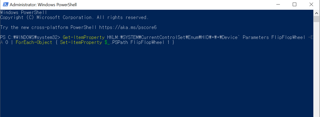 Get-ItemProperty HKLM:\SYSTEM\CurrentControlSet\Enum\HID\*\*\Device` Parameters FlipFlopWheel -EA 0 | ForEach-Object { Set-ItemProperty $_.PSPath FlipFlopWheel 1 }