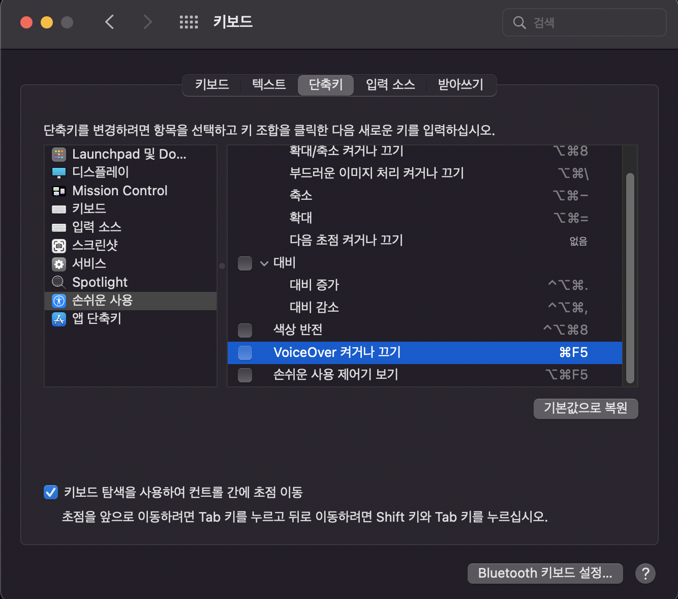 - 시스템 환경설정 > 키보드 > 단축키 > 손쉬운 사용 > VoiceOver 켜거나 끄기 체크 해제