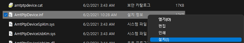 4. AmtPtpDevice.inf 파일 우클릭 -> 설치 클릭 (윈도우 11은 "더 많은 옵션 표시" 를 눌러야 나온다.)