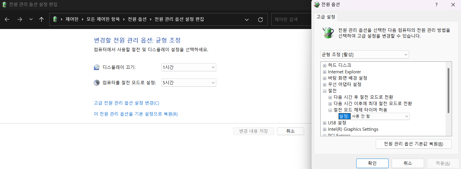 2. 전원 관리 옵션 설정 편집 > "고급 전원 관리 옵션 설정 변경(C)" 클릭 > 절전 > 절전 모드 해제 타이머 허용 > 설정 : 사용 안 함 으로 변경