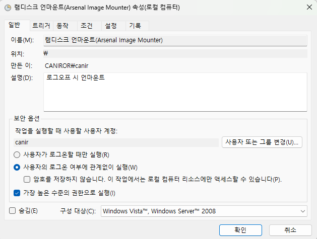 작업 스케줄러에서 로그오프 시 (이벤트 - 보안 - 이벤트 ID 4647) 언마운트하도록 설정했다.
