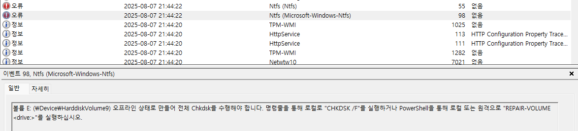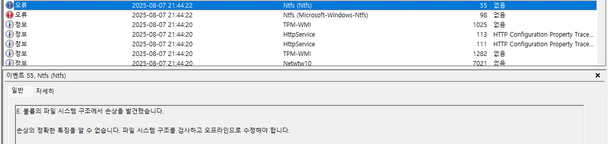 이벤트 뷰어에는 아래와 같은 오류가 발생해있다.