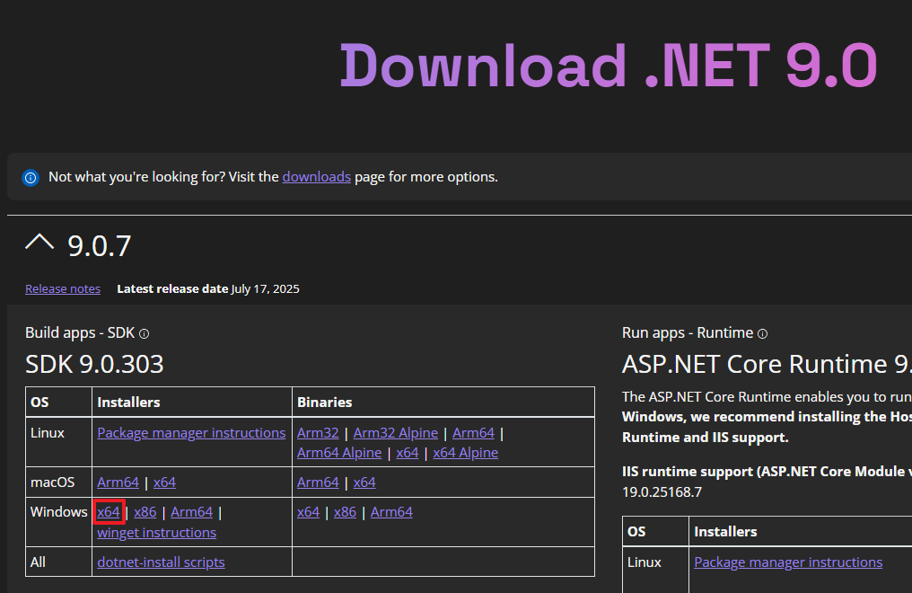 여기서 닷넷 SDK 9.0 버전이 필요하므로 다운로드 받으라고 하는데,