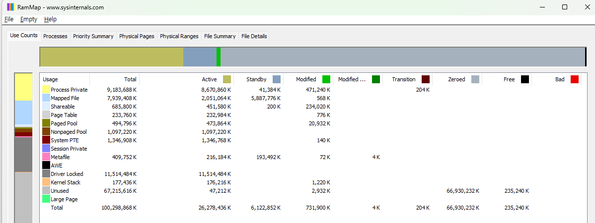 RamMap 프로그램의 Driver Locked 항목은 디바이스 드라이버에 의해 물리 메모리에 고정된 메모리 영역을 나타내는 값이야. 이 영역은 운영체제가 페이지 아웃(디스크로 스와핑) 하지 못하게 되어 있어서 항상 메모리에 상주해.