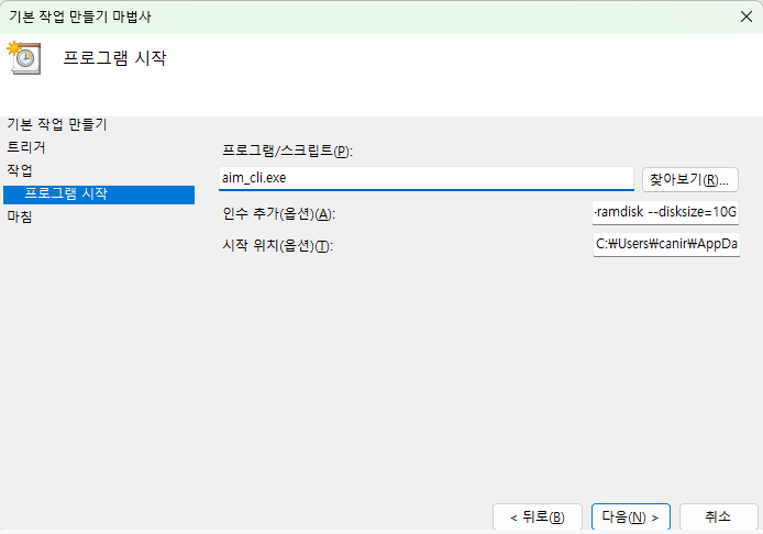프로그램 시작 파트의 시작 위치에 %localappdata%/aim 를 풀어서 작성했다.