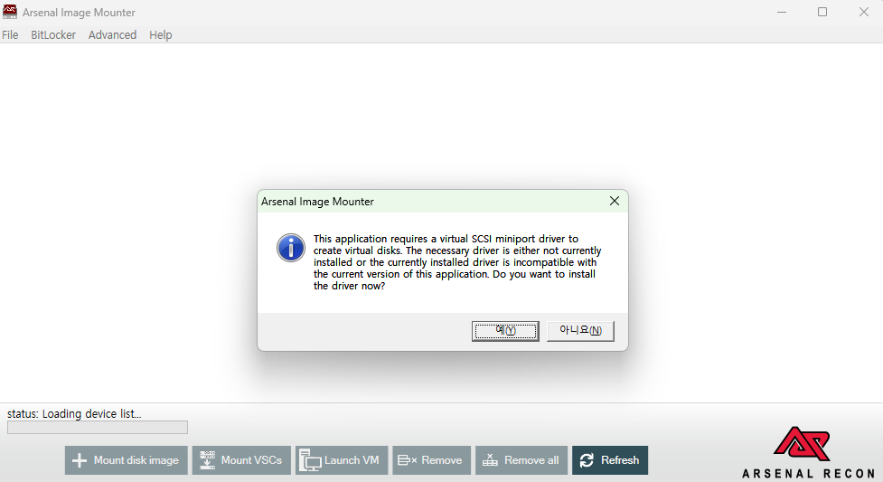 참고로 관리자 권한이 아닌 경우 "Cannot access Arsenal Image Mounter driver. Check that the driver is installed and that you are running this application with administrative privileges." 에러가 발생한다.